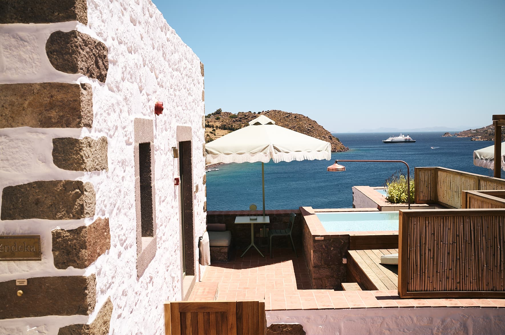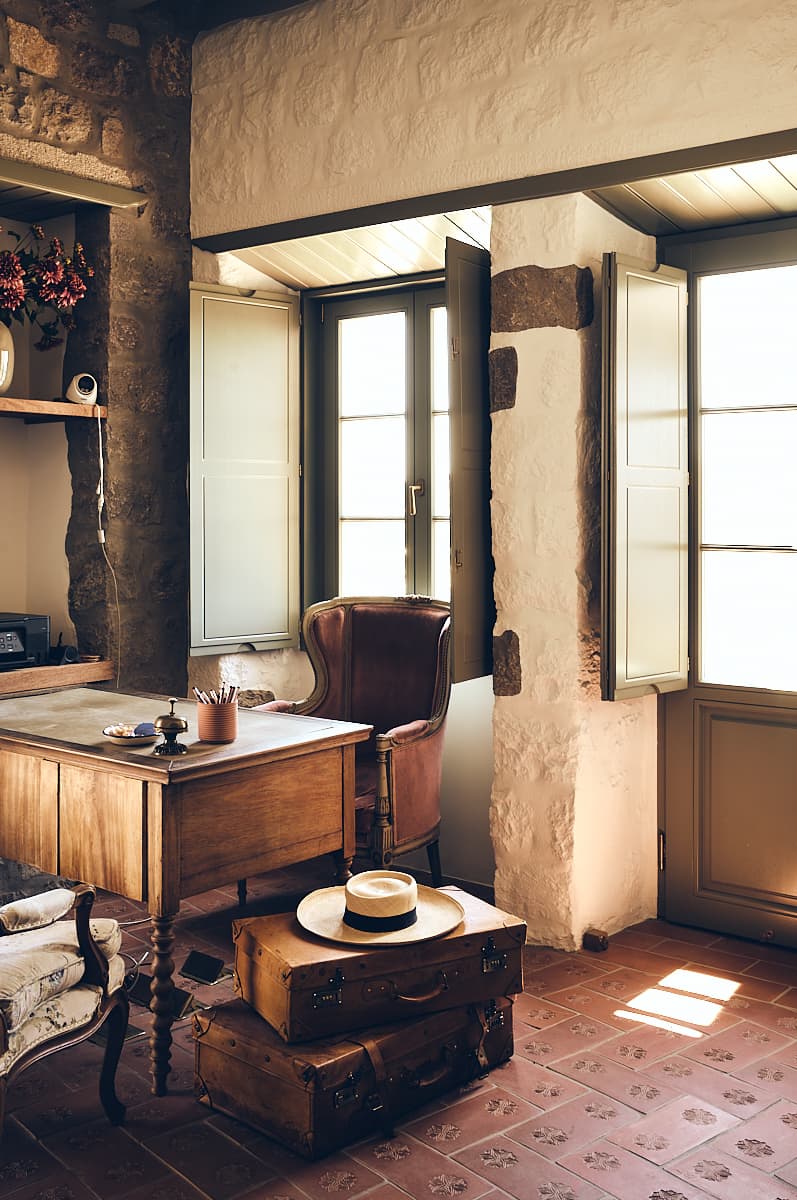 En harmonie avec l'esthétique de l'île Patmos Eye reprend avec finesse les codes architecturaux de l'île. L'encadrement des fenêtres en pierre, les volets intérieurs en bois, les murs épais préservant la fraîcheur, sans oublier les tomettes en terre cuite encore façonnées par deux artisans locaux... Une partition où chaque détail fait résonner le savoir-faire et l’âme de Patmos.